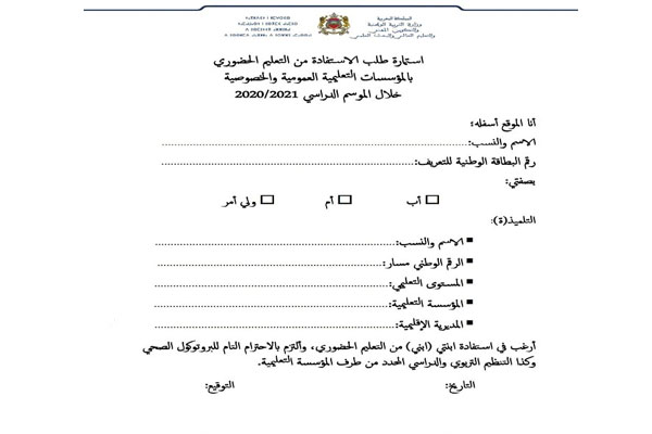 وذبلت الاستمارة بعبارة “أرغب في استفادة ابنتي (ابني) من التعليم الحضوري، وألتزم بالاحترام التام للبروتوكول الصحي وكذا التنظيم التريوي والدراسي المحدد من طرف المؤسسة التعليمية”.