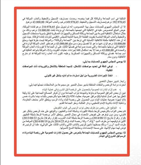 أهم الملاحظات والتوصيات التي جاء بها تقرير المجلس الأعلى للحسابات فيما يخص جماعة غفساي وذلك من الفترة الممتدة ما بين سنة 2012 إلى غاية سنة 2018، نذكر منها إختلالات في تدبير قطاع التعمير، حيث لاحظ مفتشو المجلس الأعلى للحسابات أن عددا من البنايات العمومية باشرت البناء دون الحصول على رخصة للبناء وأداء الرسوم ومن بين هذه البنايات نذكر دار الطالبة وداخلية الإناث بثانوية الإمام الشطيبي حيث أن هذه الأخيرة كانت قد شهدت عدة تصدعات في البناية نظرا لضعف الجودة في البناء حيث تجلى ذلك في وقوع تسربات لمياه الأمطار عبر الأسقف مما خلق موجة من الرعب انذاك في صفوف التلميذات النزيلات بداخلية الاناث وتبعتها موجة من الاحتجاجات في أوساط التلاميذ وأوليائهم مخافة وقوع تماس كهربائي، وعليه نجد أن ملاحظات وتوصيات المجلس الأعلى للحسابات جد منطقية حول هذه البناية بالذات، كما ذكر التقرير تأخرا كبيرا في إنجاز عدة مشاريع، حيث ذكر أن من مجموع 17 مشروع لم يتم الشروع في إنجاز الا 6 ستة مشاريع والتي لم تتعدى فيها الأشغال 60 % خلال نفس السنة من صدور التقرير وعليه فقد خلص التقرير إلى عدة توصيات أبرزها ضرورة تحديد ودراسة المشاريع التنموية المسطرة وفق الامكانيات المالية المتاحة والعمل على تنزيلها وفق آجال معقولة، كذلك ذكر التقرير اختلالات على المستوى الإداري فيما يخص توقيع بعض نواب الرئيس على وثائق دون تفويض من الرئيس، هذه أبرز الملاحظات والتوصيات التي جاء بها تقرير المجلس الأعلى للحسابات ونترككم مع صور الوثائق التي تضمنت هذه الملاحظات والتوصيات للإطلاع على التقرير بشكل مفصل.