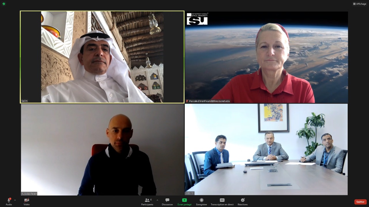 حضر الاجتماع، من قطاع العلوم والتقنية بالإيسيسكو، كل من: الدكتور رحيل قمر، مدير القطاع، والدكتور محمد شريف، مستشار بالقطاع، والدكتور عبد الرحمن، خبير بالقطاع، ومن جامعة الفضاء الدولية السيد نيكولاس بيتر، أستاذ الممارسة في سياسة الفضاء والشؤون الدولية بالجامعة.