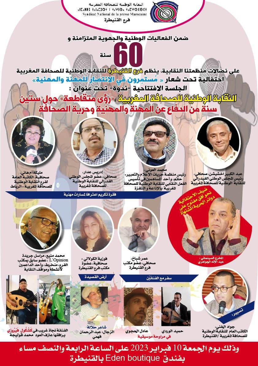 ينظم فرع القنيطرة للنقابة الوطنية للصحافة المغربية، احتفالية القنيطرة تحت شعار: " مُستمِرون في الانتصار للمهنة والمهنية"، وذلك ضمن الفعاليات الوطنية والجهوية المتزامنة و 60 سنة على نضالات منظمتنا النقابية، وهذا هو البرنامج :