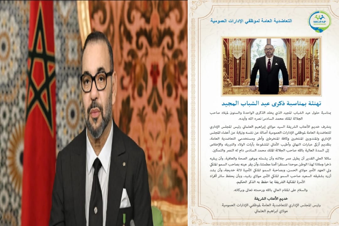 يتشرف خديم الأعتاب الشريفة السيد مولاي ابراهيم العثماني رئيس المجلس الإداري للتعاضدية العامة لموظفي الإدارات العمومية أصالة عن نفسه ونيابة عن أعضاء المجلس الاداري والمندوبين المنتخبين وكافة المنخرطين وأطرومستخدمي التعاضدية العامة، بتقديم أطيب الأماني وأغلى المتمنيات بالنصروالتمكين راجيا من المولى العلي القديرأن يعيد أمثال هذه الذكرى المجيدة على مولانا أميرالمؤمنين صاحب الجلالة الملك محمد السادس نصره الله وأيده بالعزوالتأييد.