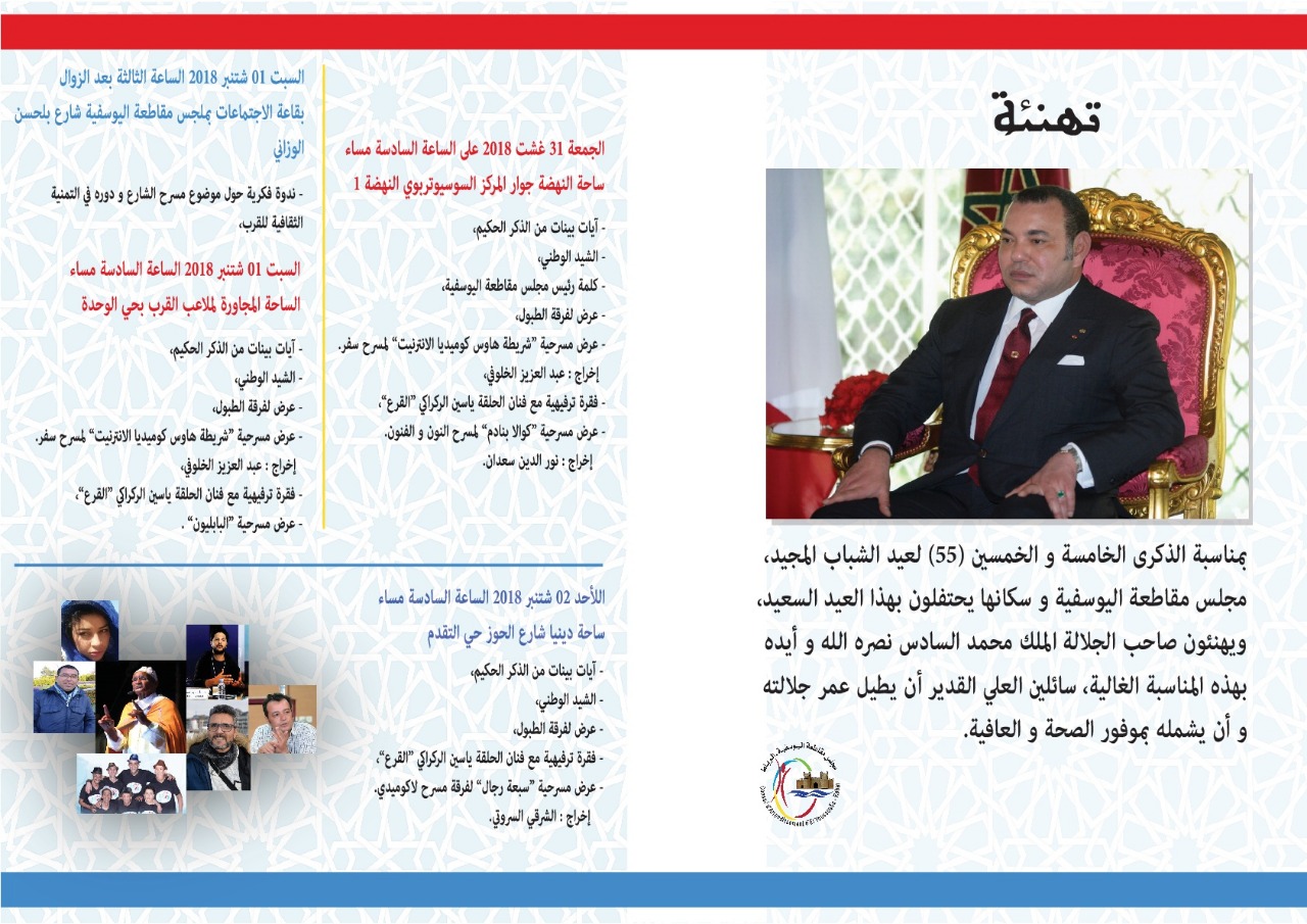 بمناسبة عيد الشباب المجيد ينظم مجلس مقاطعة اليوسفية الرباط الدورة الثانية "أيام مسرح الشارع " في الفترة الممتدة مابين 31 غشت و 2 شتنبر تحت شعار "مسرح الشارع في خدمة التنمية الثقافية للقرب" وذلك بأهم الساحات العمومية بأحياء . التقدم ، النهضة ، الوحدة .