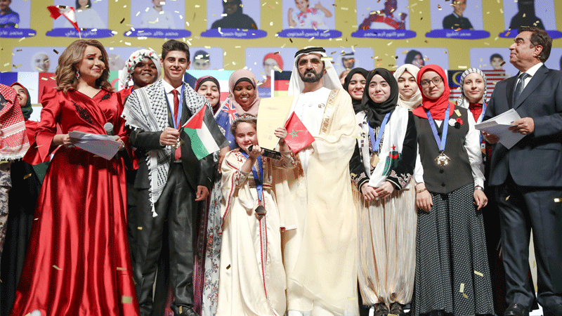 توج الشيخ محمد بن راشد آل مكتوم نائب رئيس الدولة رئيس مجلس الوزراء حاكم دبي، الطالبة مريم أمجون من المغرب بطلة لتحدي القراءة العربي في دورته الثالثة في حفل حاشد في أوبرا دبي اليوم.