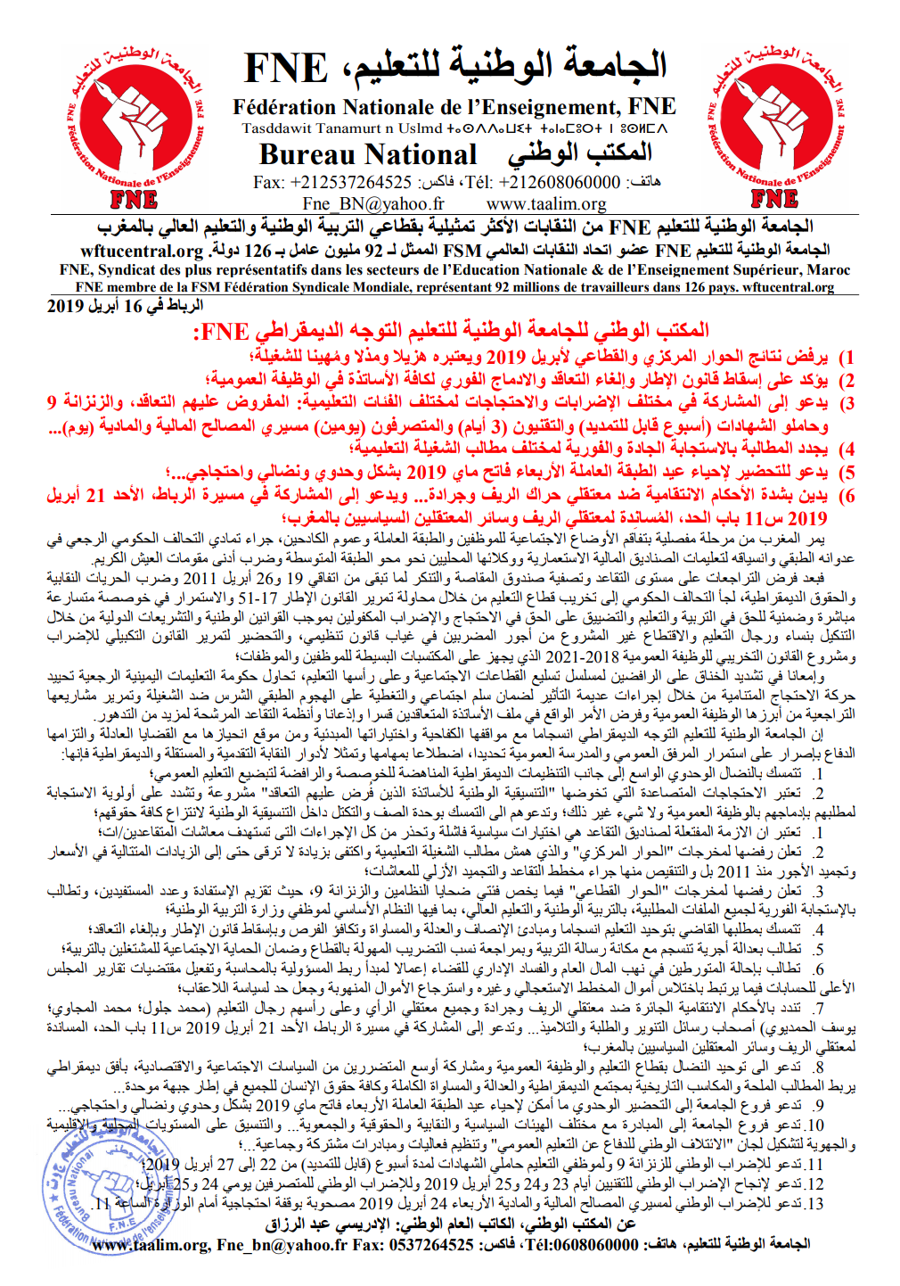 11. تدعو للإضراب الوطني للزنزانة 9 ولموظفي التعليم حاملي الشهادات لمدة أسبوع (قابل للتمديد) من 22 إلى 27 أبريل 2019؛