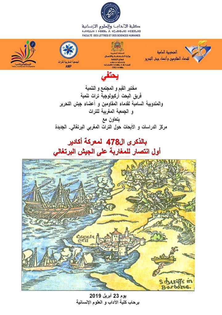 ينظم فريق البحث أركيولوجيا تراث وتنمية التابع لمختبر القيم والمجتمع والتنمية بكلية الآداب والعلوم الإنسانية- جامعة ابن زهر بأكادير، والمندوبية السامية لقدماء المقاومين وأعضاء جيش التحرير والجمعية المغربية للتراث، بتعاون مع مركز الدراسات والأبحاث حول التراث المغربي البرتغالي التابع لوزارة الثقافة، يوما دراسيا احتفالا بالذكرى ال478 لمعركة أكادير، أول انتصار للمغاربة على الجيش البرتغالي، وذلك يوم الثلاثاء 23 أبريل 2019، بفضاء الإنسانيات برحاب كلية الآداب والعلوم الإنسانية بأكادير. من المعروف أن تاريخ مدينة أكادير تاريخ عريق يمتد إلى أزيد من خمسة قرون، عرفت فيه الشهرة والازدهار والأحداث البطولية، لعل أهمها معركة أكادير التي وقعت يوم 14 مارس 1541، محققة أول انتصار للمقاومين المغاربة على الجيش البرتغالي، وذلك بقيادة السلطان محمد الشيخ السعدي. وقد أسفرت المعركة عن طرد البرتغاليين نهائيا من حصنهم الشهير سانتا كروز لرأس ايغير Santa Cruz do cabo do Guer، الذي شيدوه سنة 1505 في المكان المسمى حاليا حي فونتي الواقع أسفل الجبل المطل على خليج أكادير، وذلك بهدف للاستحواذ على الموارد الطبيعية الهامة(البحرية و الفلاحية و المعدنية) التي تزخر بها منطقة سوس.
