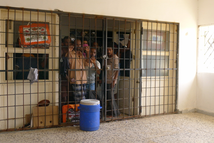 واشار التقرير الاممي الى شهادات لمهاجرين من اريتريا اعتقلوا عام 2016 في طرابلس على يد عناصر من قوة خاصة مرتبطة بوزارة الداخلية الليبية سلمتهم مجددا الى المهربين "مقابل اموال".مهاجرون يتجمعون وراء مدخل الطابق الأول من مركز الاحتجاز.