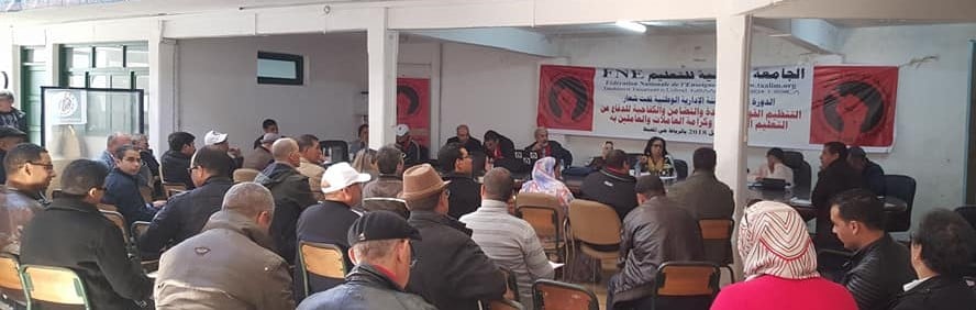 اللجنة الإدارية الوطنية للجامعة الوطنية للتعليم -التوجه الديمقراطي FNE- ترفض الحوارات المغشوشة وتُثمن مبادرات الإئتلاف للدفاع عن التعليم العمومي وتُطالب بالاستجابة للمطالب الفئوية والعامة والمشتركة انعقدت يوم الأحد 1 أبريل 2018 الدورة الثالثة العادية للجنة الإدارية الوطنية للجامعة الوطنية للتعليم تحت شعار: "التنظيم القوي والوحدة والتضامن والكفاحية للدفاع عن التعليم العمومي وكرامة العاملات والعاملين به" وبعد تقرير المكتب الوطني المقدم من طرف الرفيق الإدريسي عبد الرزاق والتقرير المالي المقدم من طرف الرفيق السباعي أحمد، باسم المكتب الوطني، ومداخلات عضوات وأعضاء اللجنة الإدارية، حيث تم تثمين المبادرات والدينامية التنظيمية والتكوينية والإشعاعية المحلية والإقليمية والجهوية والوطنية والدولية للجامعة.. رغم التضييق على فروع وأنشطة الجامعة الداخلية والاشعاعية، كما تم التداول والنقاش حول الوضع التعليمي والأوضاع العامة التي تعيشها بلادنا، في سياق الحراكات الاجتماعية في القرى والمدن المفقرة (الريف، زاكورة، جرادة،...)، جراء غياب شروط العيش الكريم والتضييق على الحريات المدنية والسياسية والنقابية، والارتفاع المستمر في الأسعار، وتخلي الدولة عن مسؤولياتها اتجاه الخدمات العمومية وعلى رأسها التعليم..، وبعد وقوفها على انطلاق جلسات الحوار الاجتماعي القطاعي بين النقابات التعليمية والوزارة والمركزي بين المركزيات النقابية وممثلي الحكومة والباطرونا وتتبعها للمنهجية التي تُدار بها، فإن اللجنة الإدارية الوطنية للجامعة: