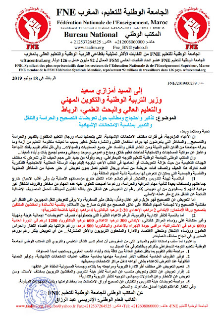 عبد الرزاق الإدريسي يوجه رسالة إلى وزيرالتربية الوطنية بتاريخ التلاثاء 18 يونيو 2019 إلى السيد أمزازي سعيد وزير التربية الوطنية والتكوين المهني والتعليم العالي والبحث العلمي الرباط داخل مراكز الامتحانات و بمحيطها مع إقرار تعويض مهم عن التنقل و التدبير و الحراسة و التصحيح لأطر التدريس و أطر التفتيش و سن تعويض عن الأخطار.
